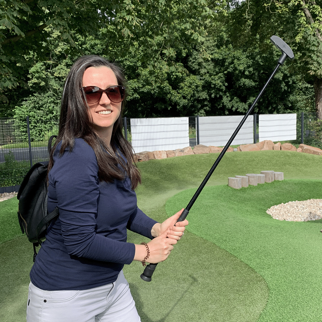 a golf club in her hand, it’s more than likely to be a putter on the mini golf course.